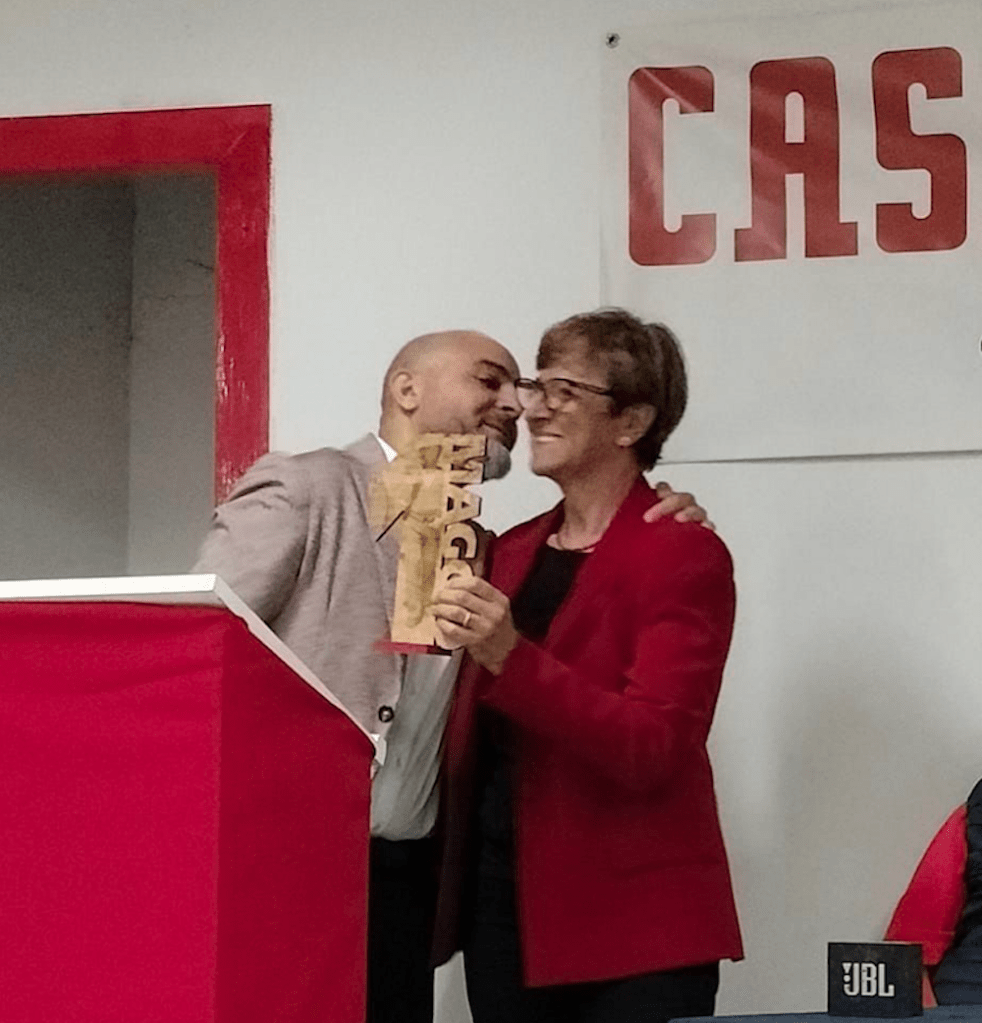 Nelle mani di Michele Gaglione, delle lavoratrici dell’ex Ipercoop, di Rosi, il bellissimo premio creato da Roberto Fatigati che col legno ha dato corpo al grazie per la loro testimonianza.