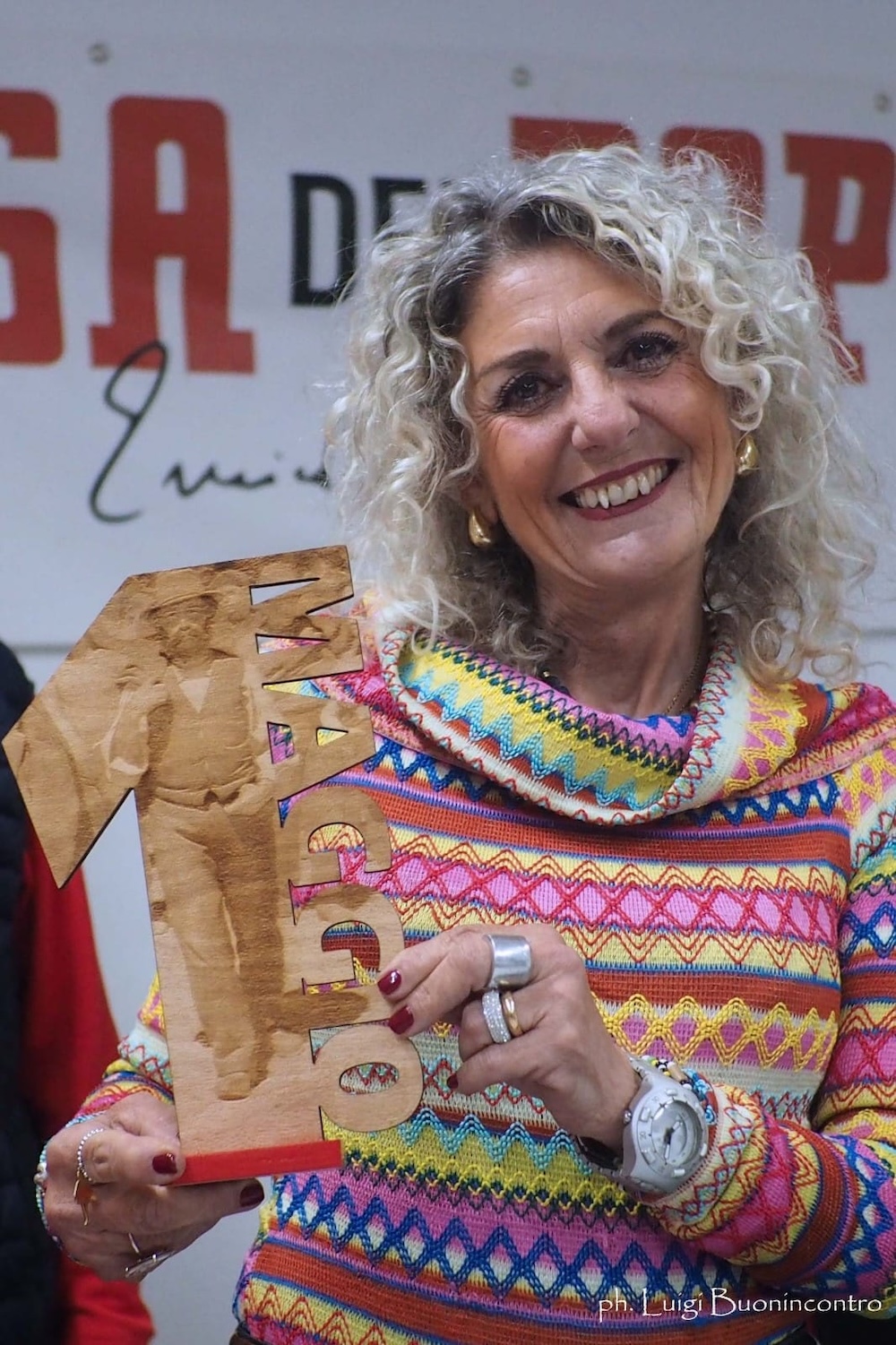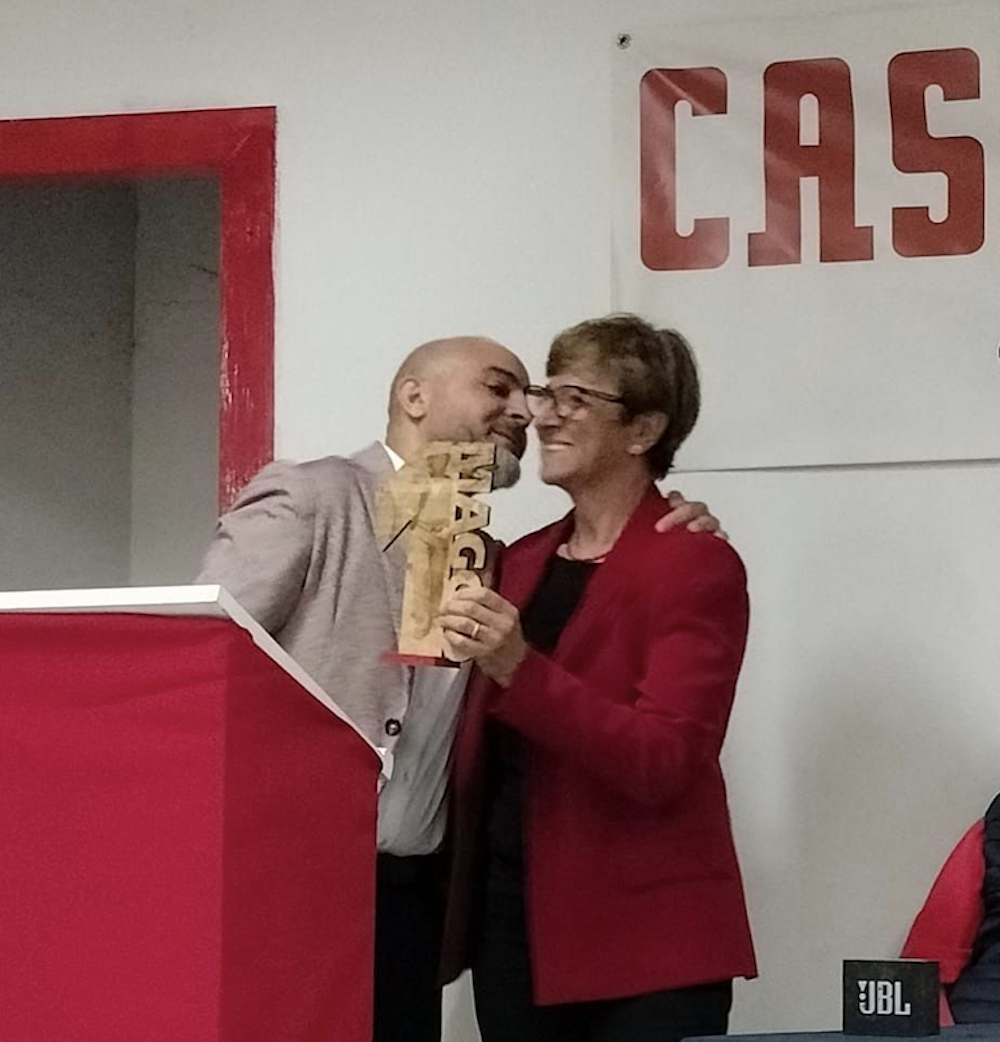 Nelle mani di Michele Gaglione, delle lavoratrici dell’ex Ipercoop, di Rosi, il bellissimo premio creato da Roberto Fatigati che col legno ha dato corpo al grazie per la loro testimonianza.